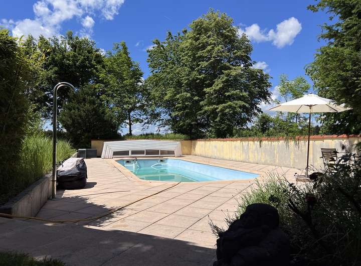 Balkon, Terrasse, Garten, Vollbad, Pool · Schwimmbad, Einbauküche, Gäste-WC, Kamin, Parkett, Laminat, Fliesen