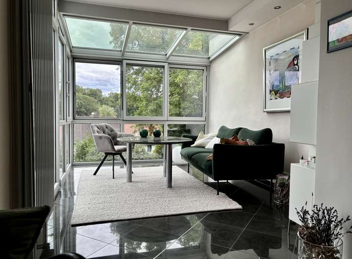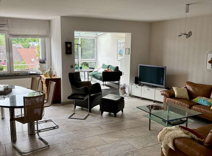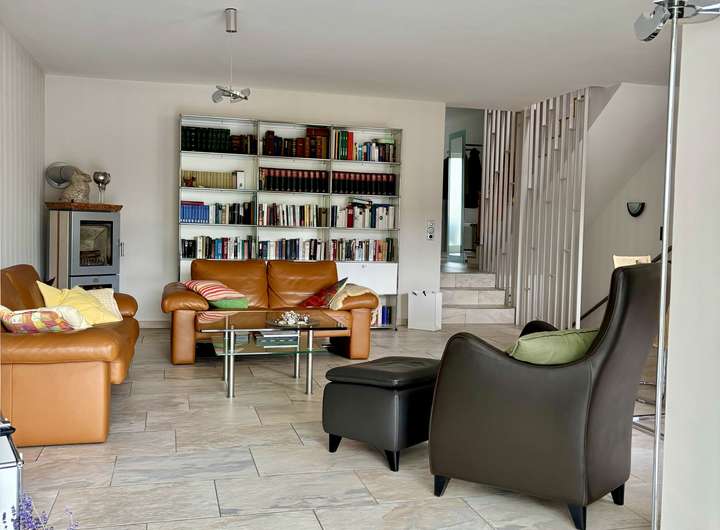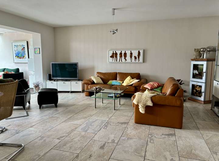 * Großzügiger Wohnbereich mit Kaminofen, angrenzendem Wintergarten (Anbau 2007) und Balkon mit Blick ins Grüne