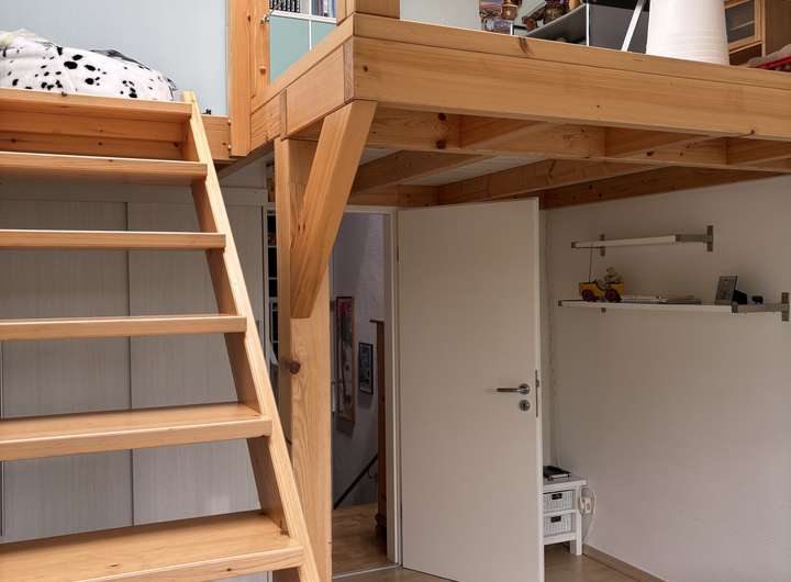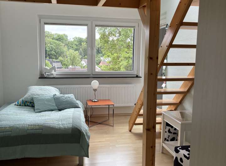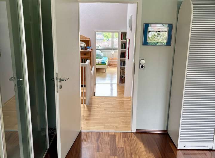 * Zwei weitere Zimmer im Obergeschoss, jeweils mit Balkonzugang; eines davon bietet zusätzlichen Wohnraum durch eine eingezogene Zwischendecke