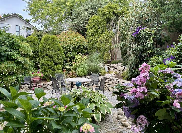 * Attraktiver, gepflegter Garten mit großer Terrasse, liebevoll angelegtem Vorgarten/Vorhof mit Brunnen und Gartenhäuschen