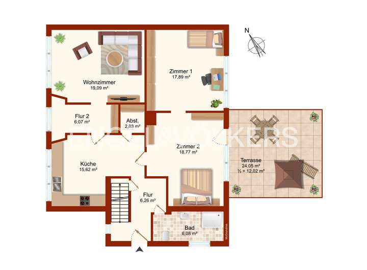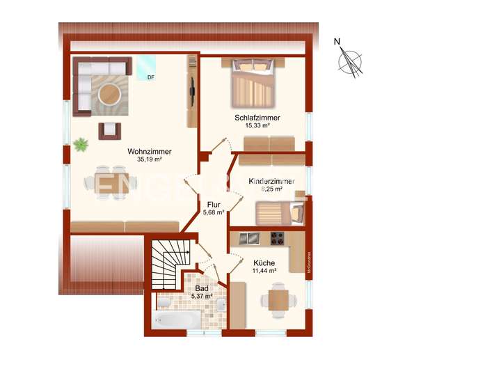 Die Wohnung im Erdgeschoss verfügt über ca. 104 m² Wohnfläche und umfasst drei gut geschnittene Zimmer, eine Küche sowie ein hell gefliestes Duschbad. Der direkte Zugang zur Terrasse und zum gepflegten Garten macht diese Etage besonders attraktiv für Familien oder Eigennutzer mit Platzbedarf.