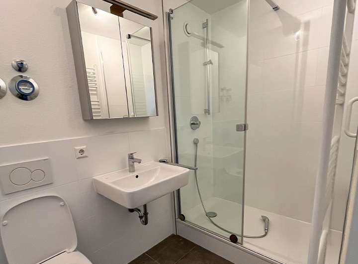 Das innenliegende Badezimmer ist modern gefliest und mit einer komfortablen Dusche sowie einem Spiegelschrank ausgestattet.