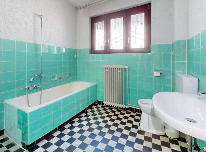 o Badezimmer mit Badewanne, WC, Waschbecken und Fenster