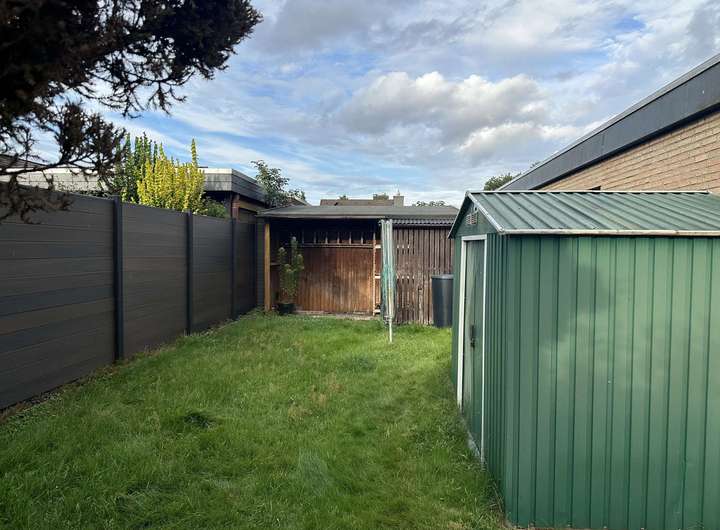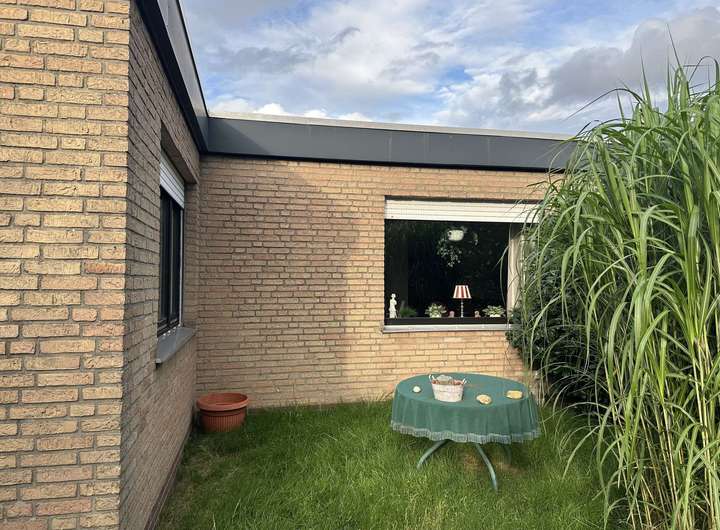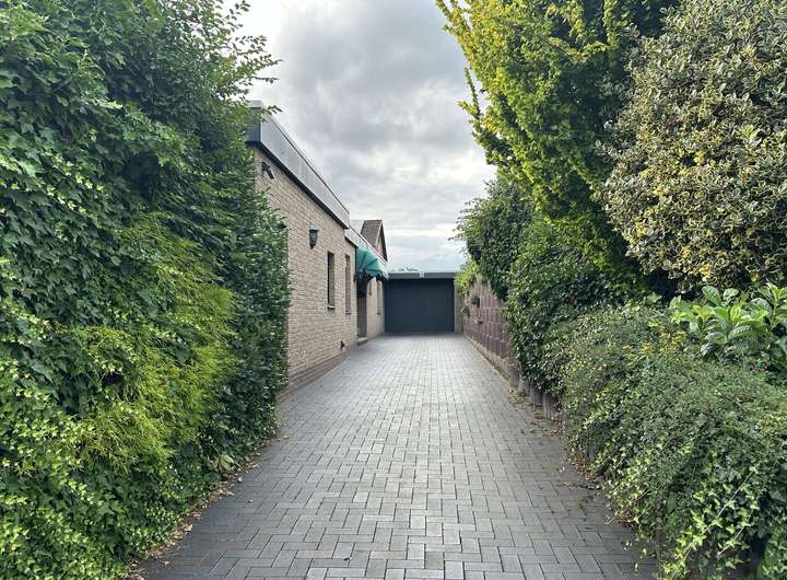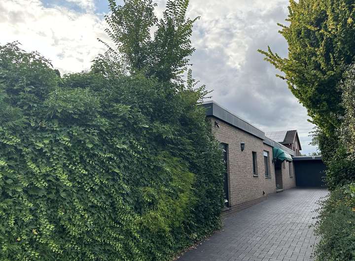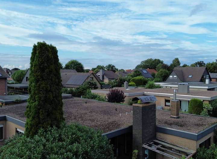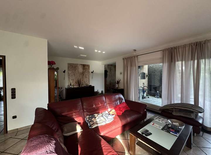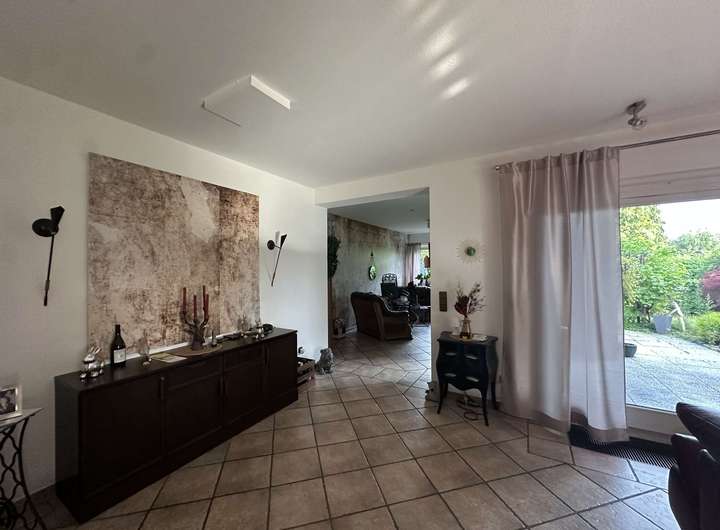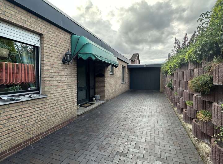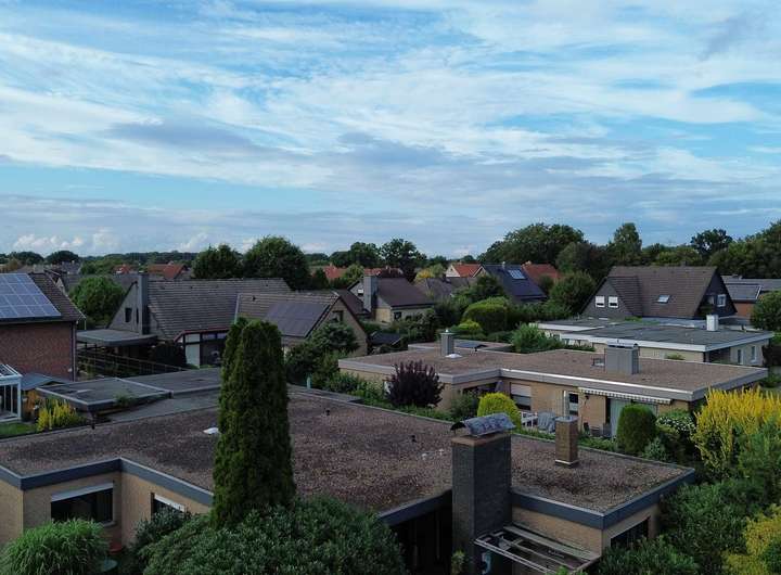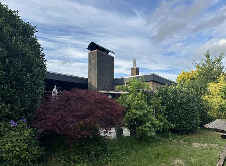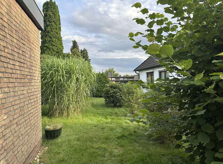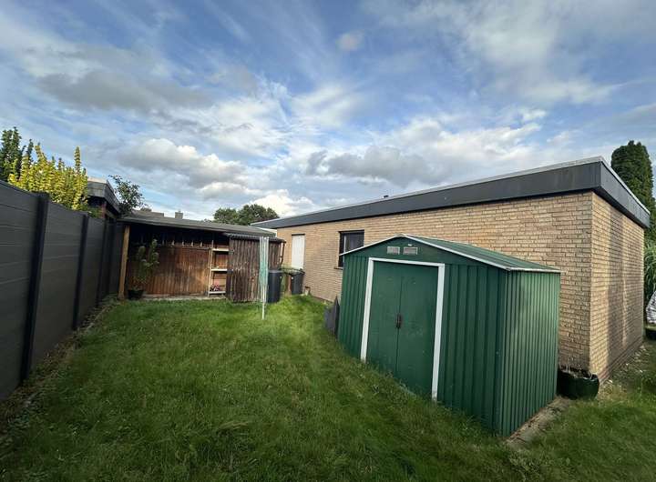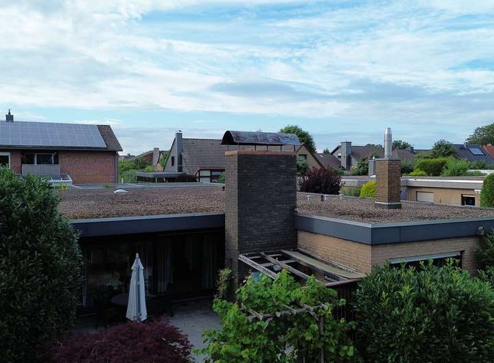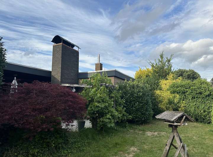 Dieses 1975 erbaute Einfamilienhaus überzeugt durch seine ruhige Wohnlage, die großzügige Raumaufteilung sowie den schönen Garten. Das eingeschossige Haus mit Flachdach bietet auf ca. 142 m² Wohnfläche fünf Zimmer, zwei Badezimmer und ein Gäste-WC. Besonders hervorzuheben sind die große Terrasse mit Blick ins Grüne, der Kamin im Wohnzimmer für gemütliche Stunden sowie der praktische Abstellschuppen.