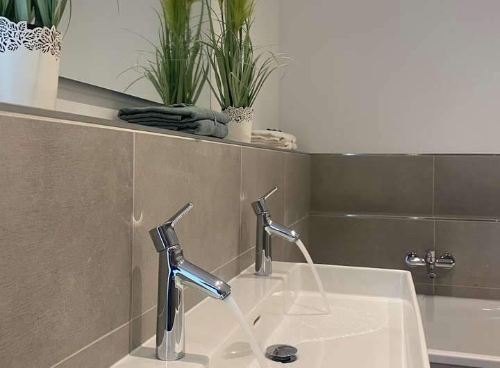 • Exklusive Badausstattung namhafter Hersteller wie z. B. Waschtischarmaturen von Hansgrohe und Keramik-Objekten des Fabrikats Ideal Standard, Serie Connect Cube und Extra