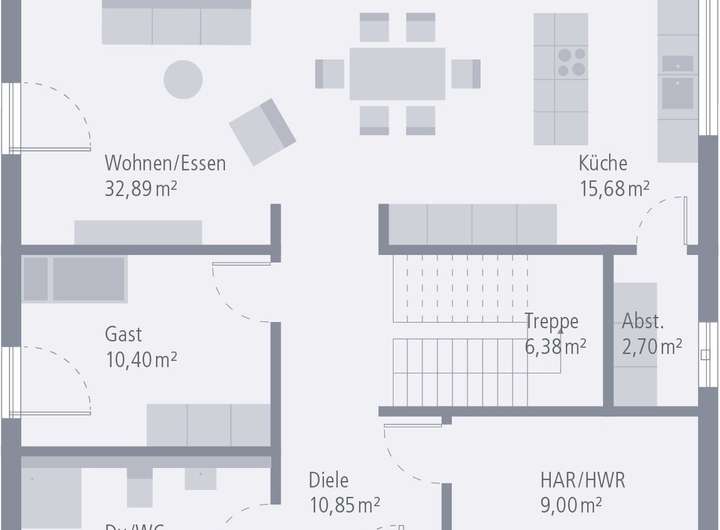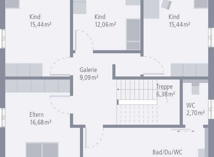 Als wahres Raumwunder entpuppt sich die Stadtvilla 21. Auf einer Wohnfläche von knapp 190 m² finden hier Familien mit bis zu drei Kindern Platz - und haben sogar noch Gelegenheit, Schlafgästen einen eigenen Raum zur Verfügung zu stellen oder sich alternativ ein Büro oder einen Hobbyraum einzurichten. Durch die freundliche und helle Diele führt der Weg direkt in den Wohn-Ess-Kochbereich, der das perfekte Zentrum des Familienlebens ist. Komplettiert wird das Angebot im Erdgeschoss durch ein Gästezimmer, WC, Hauswirtschaftsraum sowie eine Abstellkammer. Die obere Etage ist so konzipiert, dass dort verschiedene Nutzungsmöglichkeiten denkbar sind: Neben dem Elternschlafzimmer und einem 15 m² großen Bad mit separatem Toilettenbereich befinden sich dort drei weitere Zimmer. Hier finden drei Kinder Platz, es besteht aber auch die Option, dass einer der drei Räume als Spielzimmer fungiert.