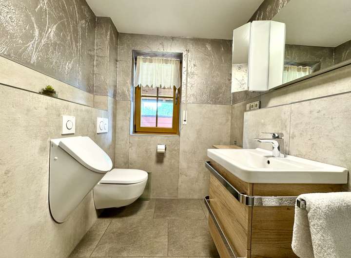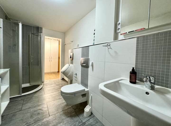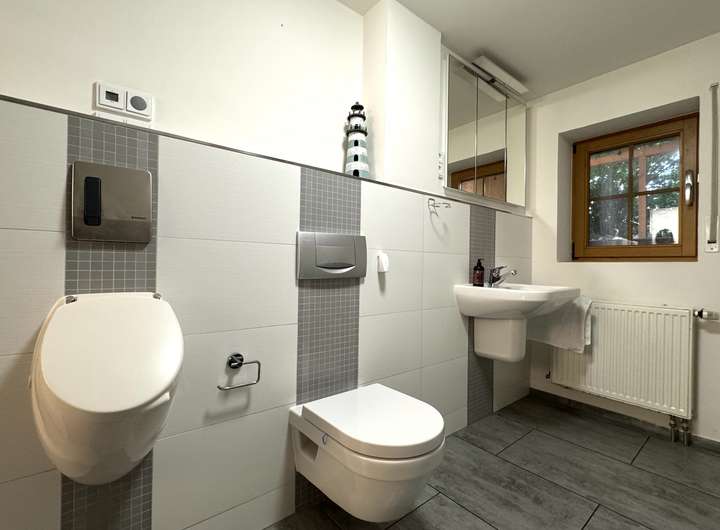 Badezimmer mit Dusche, WC und Urinal zur Verfügung. Das
