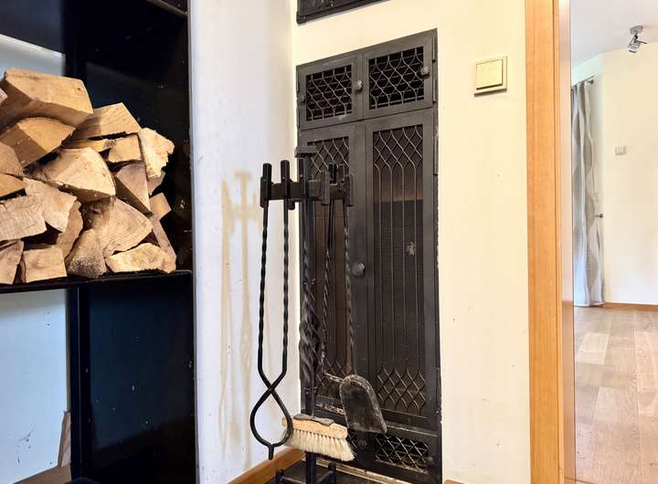 kühleren Tagen für Gemütlichkeit sorgt. Befeuert wird der Ofen im Flur.