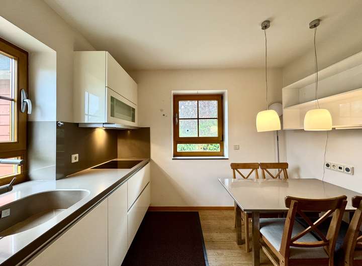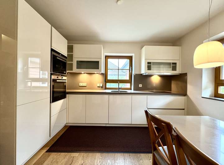 Die an das Wohnzimmer angrenzende Küche verfügt über hochwertige