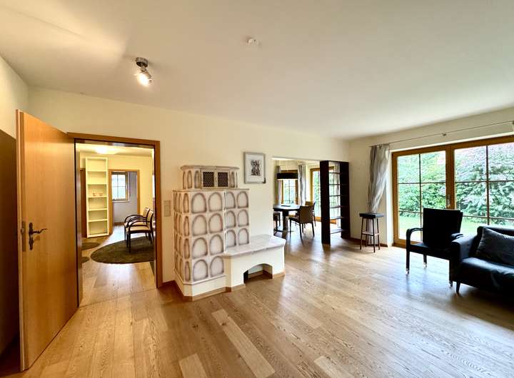 Im Wohnzimmer befindet sich ein Kachelofen mit Ofenbank, der in