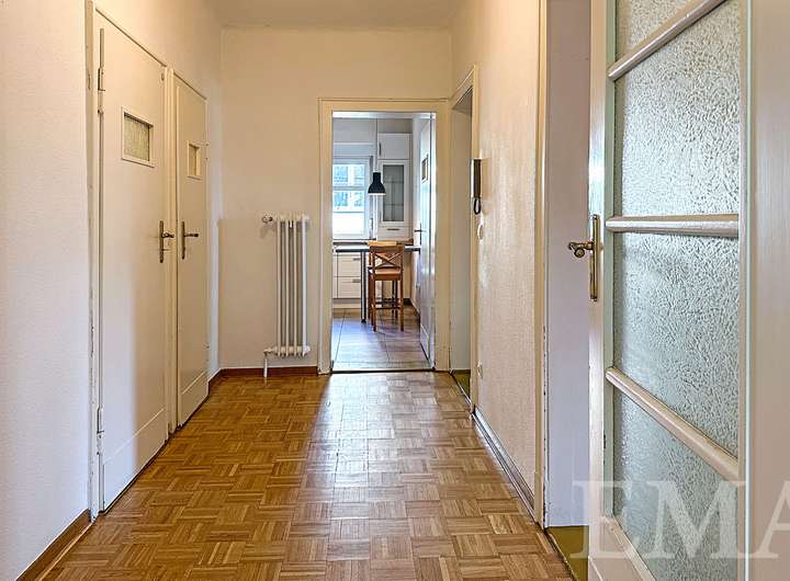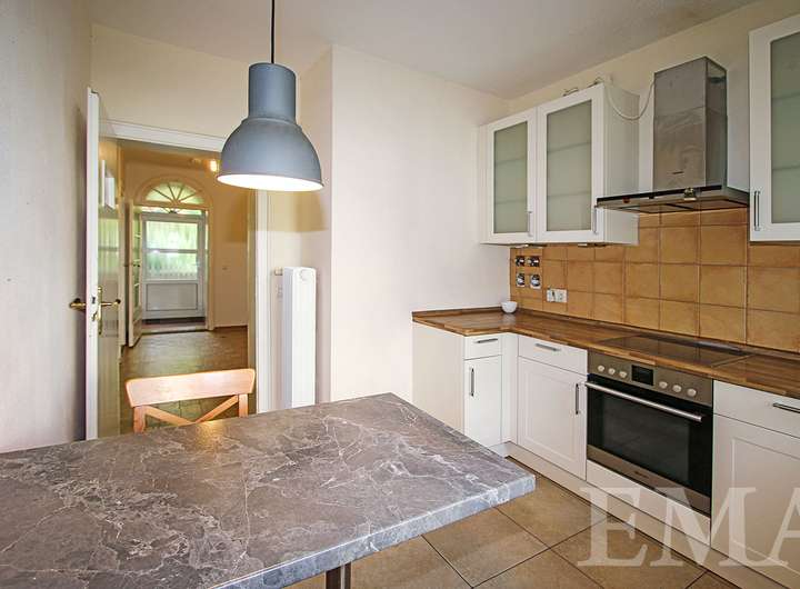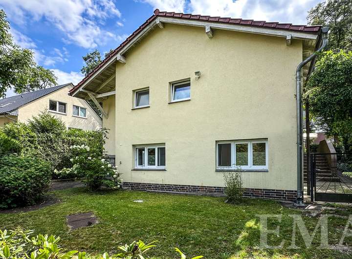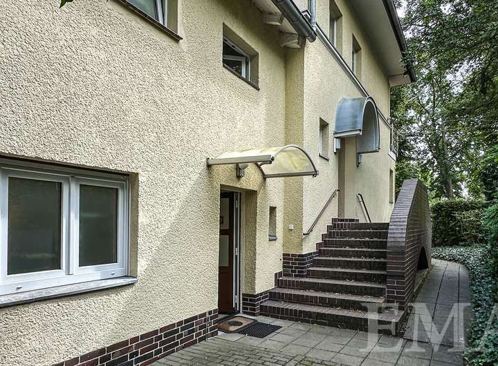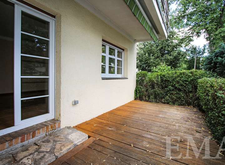 Im Erdgeschoss befinden sich ein lichtdurchflutetes Wohn- und Esszimmer mit Zugang zur Südterrasse, ein weiteres Zimmer, eine Küche mit schöner Einbauküche, ein modernes Duschbad mit bodengleicher Dusche, ein Windfang sowie ein geräumiger Flur. Im Windfang befindet sich eine Treppe ins Obergeschoss und im Flur in den Keller. Wohnräume im Erdgeschoss sind mit im Original erhaltenem Schachbrettparkett ausgestattet. Die Wohnfläche im Erdgeschoss beträgt ca. 72 m². Die Raumhöhe beträgt ca. 2,75 m.