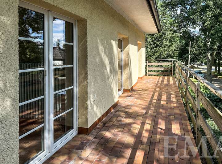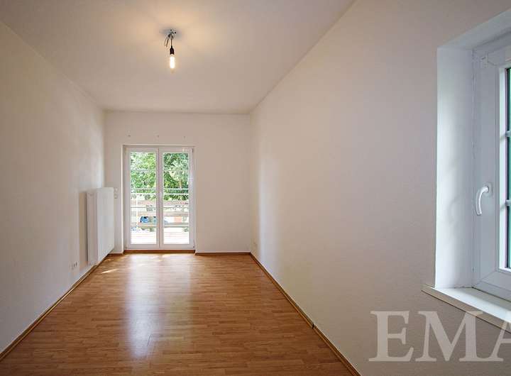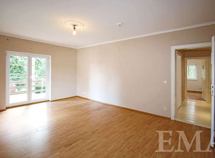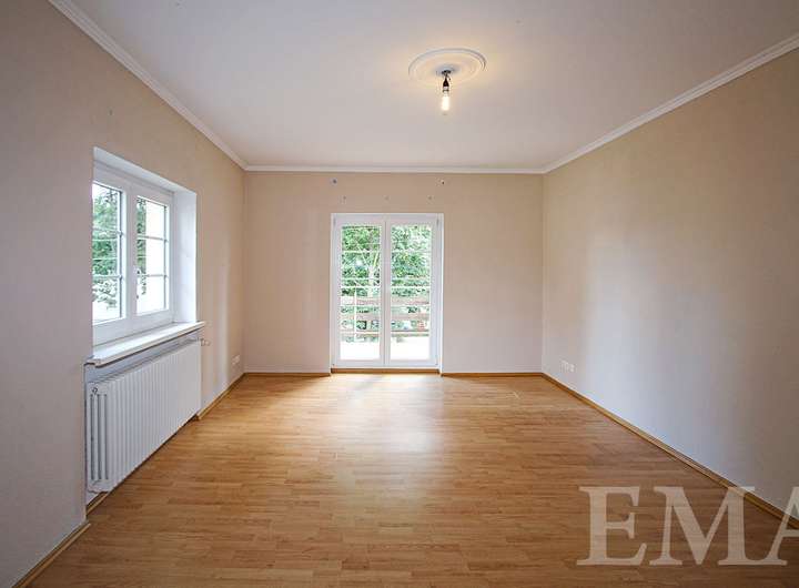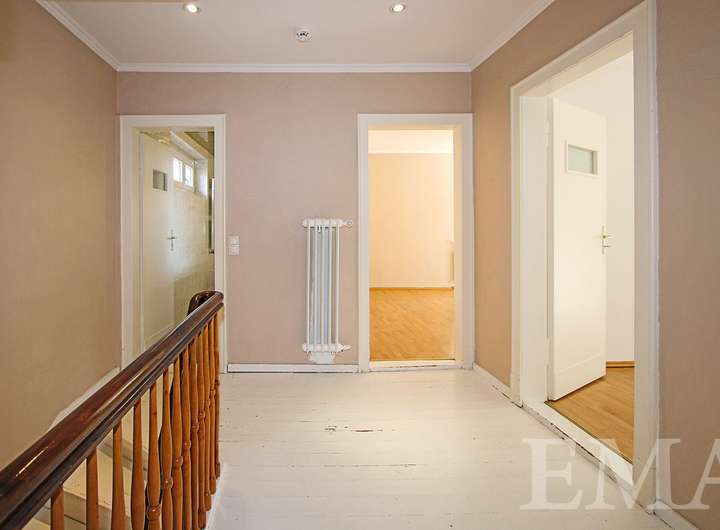 Im Obergeschoss befinden sich drei geräumige Zimmer jeweils mit Zugang zum hausbreiten Südbalkon, ein großes Badezimmer mit chinesischem Marmorboden und Eckbadewanne sowie ein großer Flur. Die Wohnfläche im Obergeschoss beträgt ca. 68 m².