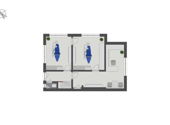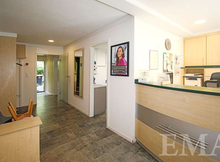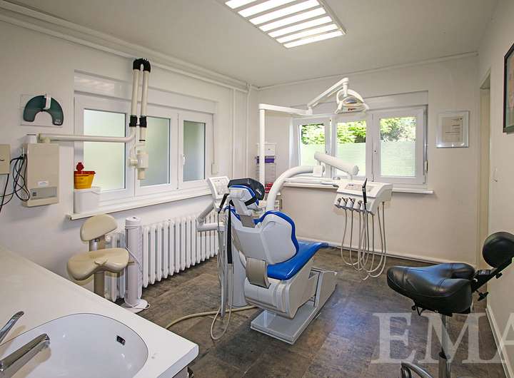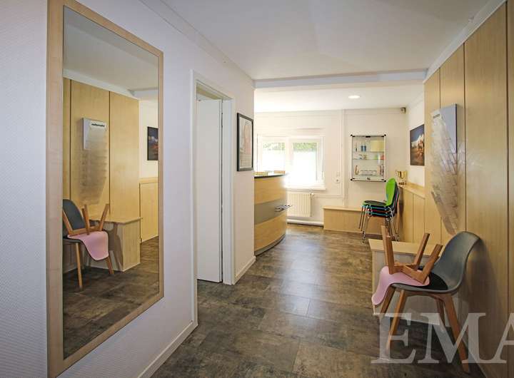 Der Praxisanbau teilt sich in Erd- und Obergeschoss auf. Im Erdgeschoss befinden sich zwei Behandlungsräume, ein Flur mit Empfangs- und Wartebereich sowie ein WC. Im Obergeschoss befinden sich drei Räume, ein Badezimmer mit Dusche, ein WC sowie ein Flur mit Küchenzeile. Die Gesamtnutzfläche in der Praxis beträgt ca. 100 m². Die Praxis ist im Moment für eine Kaltmiete von 1.500,00 € pro Monat vermietet.