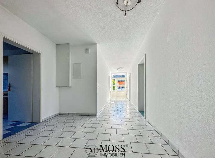 Wohnfläche. So öffnet sich der Flur in einen Verbindungsgang mit zusätzlicher Abstell- oder