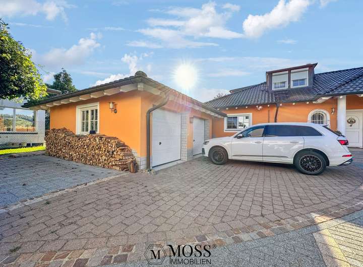 Ihr Auto parkt bequem in der riesigen Doppelgarage mit elektrischem Rolltor, weitere Stellplätze bieten sich in der Einfahrt an.