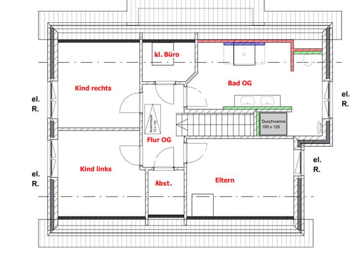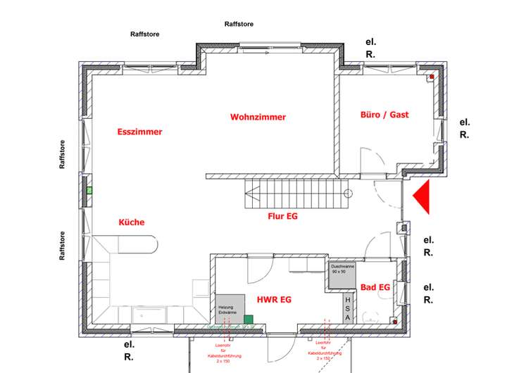 Neben den 3 Schlafräumen im Dachgeschoss bietet der gelungene Grundriss zwei weitere Räume an, die aktuell als Arbeitszimmer genutzt werden. Der Arbeitsplatz im Dachgeschoss ist recht klein und könnte auch als Hobbybereich dienen. Das Arbeitszimmer im Erdgeschoss befindet sich direkt gegenüber des Duschbads, und bietet sich daher auch als Gästezimmer an. Der Wohnbereich ist als großer offener Wohn-Ess-Küchenraum gestaltet. Ideal für eine Familie, die sich ein offenes Wohnkonzept wünscht. Der Hauswirtschaftsraum ist großzügig gehalten, hier findet die Technik ihren Platz, weiterhin sind hier die Waschmaschine und der Trockner platziert sowie weitere Abstellfläche gegeben.