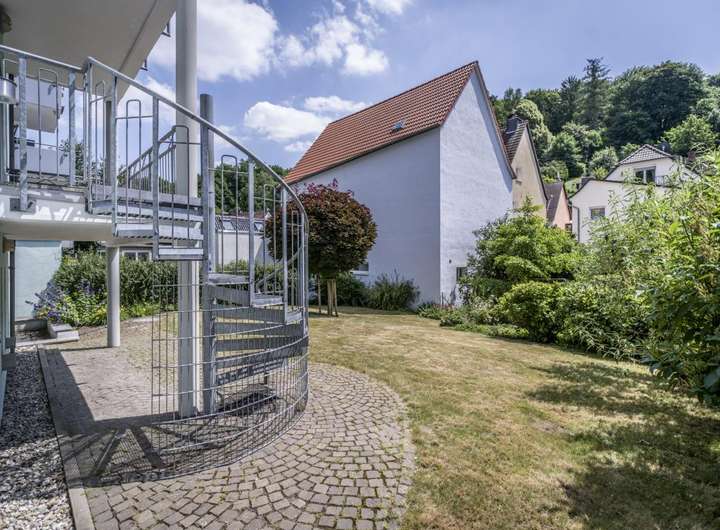 Hier stimmt es wirklich: ein wahres Raumwunder in hervorragender Qualität und Ausstattung! So sieht es aus, wenn man mit einem guten Architekten seinen Haustraum erfüllen kann: großzügige Räume, viel Fensterfläche, Balkone und Terrassen auf jeder Ebene. Ganz klassisch im Erdgeschoss: lichtdurchflutetes Wohnzimmer mit großem Balkon und Treppe zum hübschen Garten, dazu ein großes Esszimmer, eine hochwertige Einbauküche mit sonnigem Frühstückstisch, Gäste-WC und Garderobe. Im oberen Geschoss finden Schlafzimmer und eine große Badelandschaft mit Sauna statt, im Dachgeschoss ein Studioraum mit Balkon und einem kleinen separaten Gäste-Bereich mit Schlaf- und Arbeitszimmer und Duschbad. Im Gartengeschoss kann der große Raum perfekt als Büro genutzt werden, im hinteren Bereich sind Räume für Hauswirtschaft, Werkstatt und Vorratskeller vorhanden. Idealerweise öffnet sich das Tor automatisch, die Einfahrt bietet Platz für zwei Wagen. Ihre Kinder werden den Garten und das geschützte Ensemble lieben!