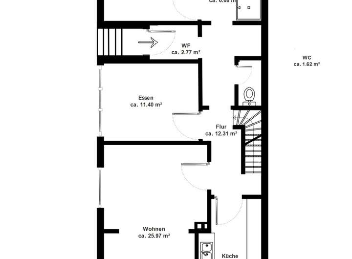 Im Erdgeschoss stehen Ihnen drei Zimmer, ein Badezimmer, ein Gäste-WC sowie eine Küche mit praktischer Einbauküche zur Verfügung.