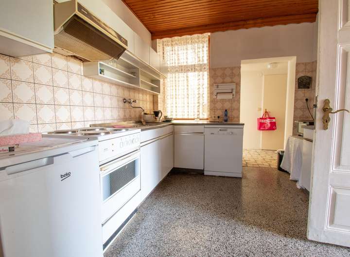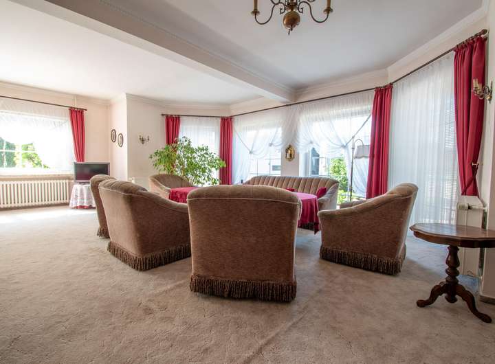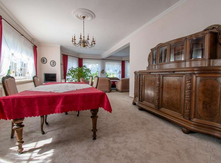Im Inneren begeistert das Erdgeschoss mit einem außergewöhnlich großzügigen Wohn- und Essbereich, ergänzt durch einen charmanten Erkeranbau aus den 1990er Jahren. Charaktervolle Details wie die Kassettentüren und der Terrazzofußboden in der Küche sind noch erhalten. Die Küche befindet sich in einem einfach gehaltenen Zustand und eignet sich ideal zur Modernisierung nach eigenen Vorstellungen. Angrenzend befindet sich ein separates Esszimmer.
