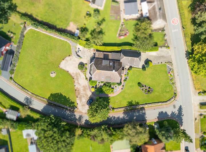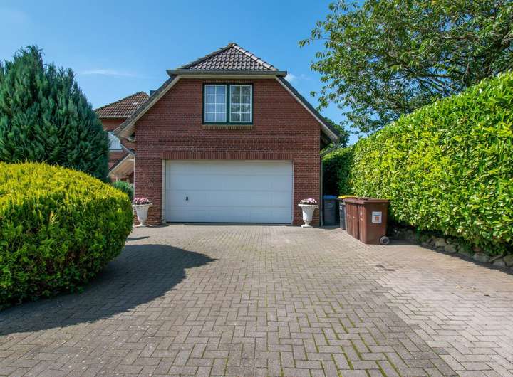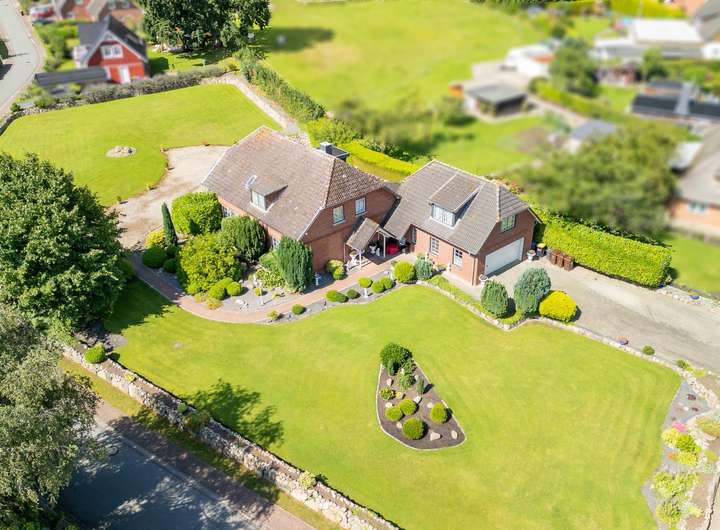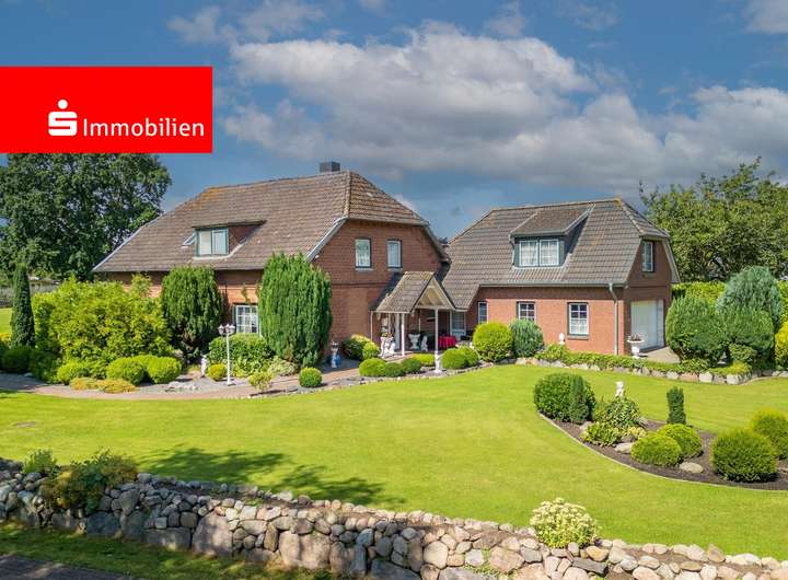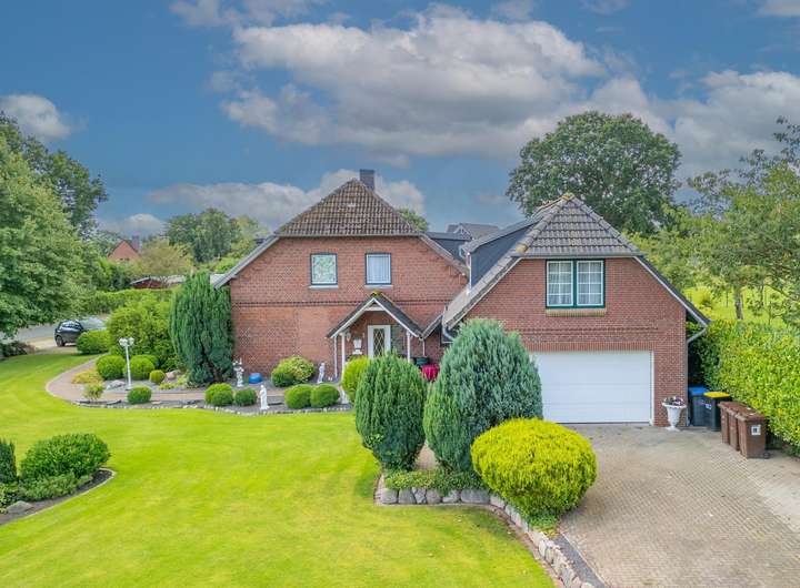 Schon beim Betreten des Hauses spürt man: Dieses Zuhause erzählt Geschichten. Die klassische Backsteinfassade, der liebevoll angelegte Friesenwall und die blühenden Gartenanlagen fügen sich harmonisch in das 2.719 m² große Grundstück ein – ein Paradies für Gartenliebhaber, Familien und alle, die das Landleben lieben.