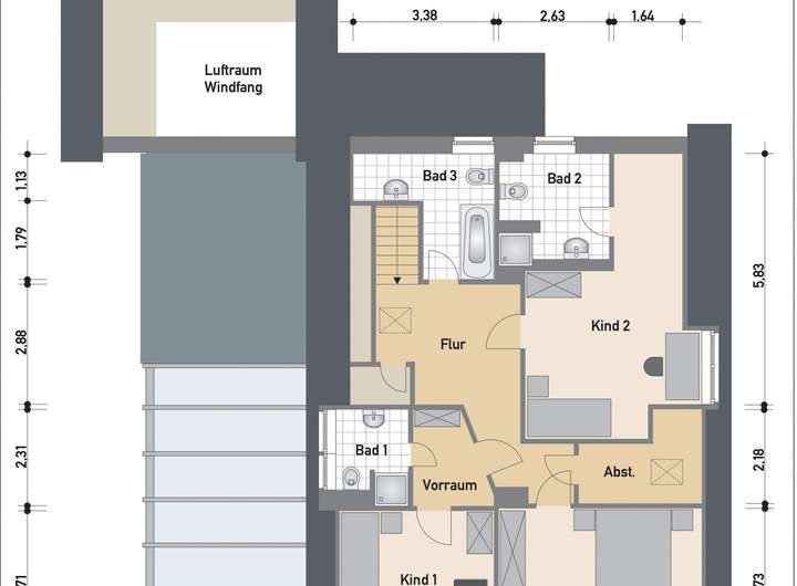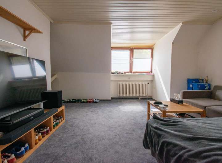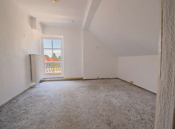 Das Dachgeschoss verfügt über drei gut geschnittene Zimmer, ein himmelblaues Wannenbad sowie zwei weitere Duschbäder – ideal für eine Familie mit Kindern oder für Paare mit dem Wunsch nach Freiraum. Ein Balkon rundet das Dachgeschoss ab und bietet Ausblick auf das gepflegte Grün.