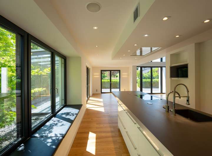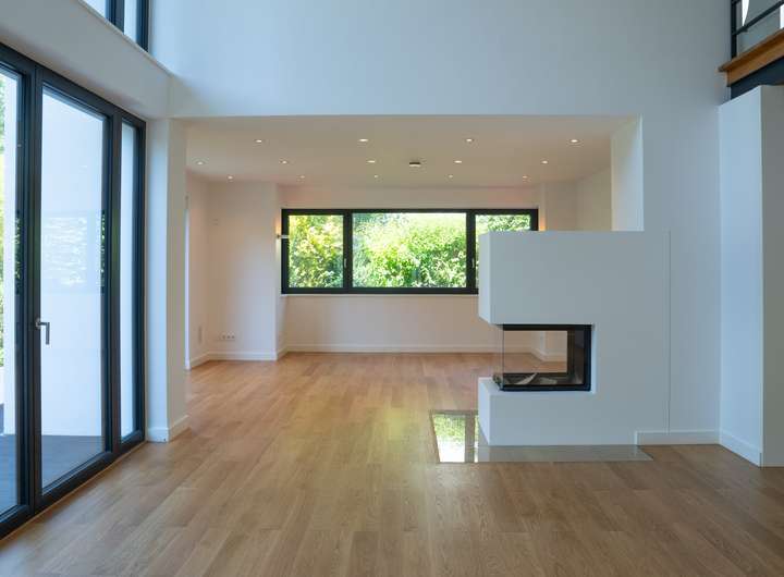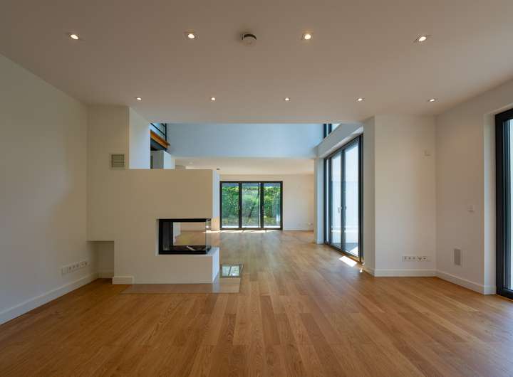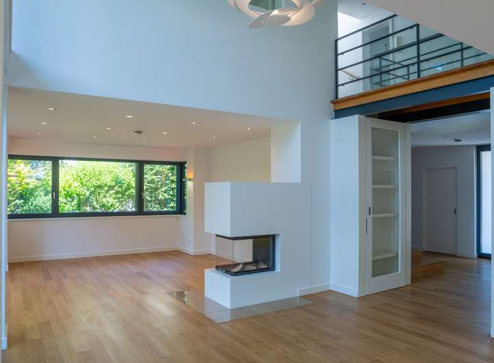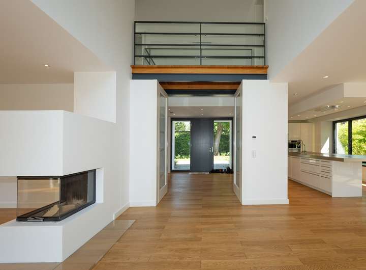 Der lichtdurchflutete Wohnbereich überzeugt mit offenen Raumstrukturen, großzügigen Lufträumen mit bis zu 5,38 m Raumhöhe, raumhohen Fensterfronten und einem eleganten Innenkamin, der eine besondere Wohlfühlatmosphäre schafft. Die hochwertige Ausstattung wird ergänzt durch hochwertige Einbaumöbel, Echtholzparkett und eine Premiumküche mit allen Geräten. Eine überdachte Terrasse erweitert das Wohngefühl nach draußen – ideal für stilvolle Abende im Freien.