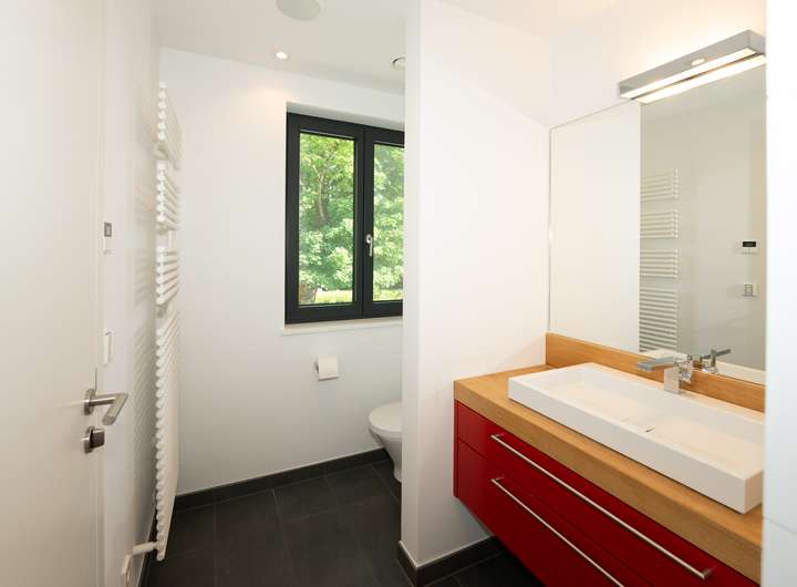 Gäste-WC im EG ausgestattet mit Handwaschbecken, WC, beleuchtetem Spiegel und Deckenstrahlern