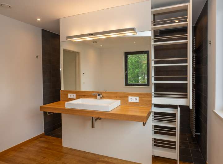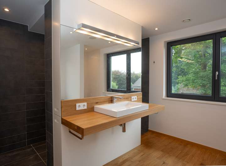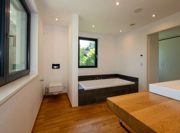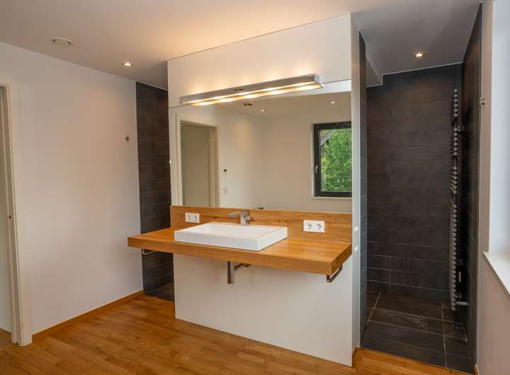 Ensuite Masterbad im OG, Große Badewanne mit Lederabdeckung, Walk-in-Dusche inkl. Rainshower, Großes Waschbecken auf Eichenplatte, Apothekerschrank verdeckt hinter Spiegel, Dornbracht-Armaturen, WC in separater Nische, Großer Spiegel und LED Deckenstrahlern