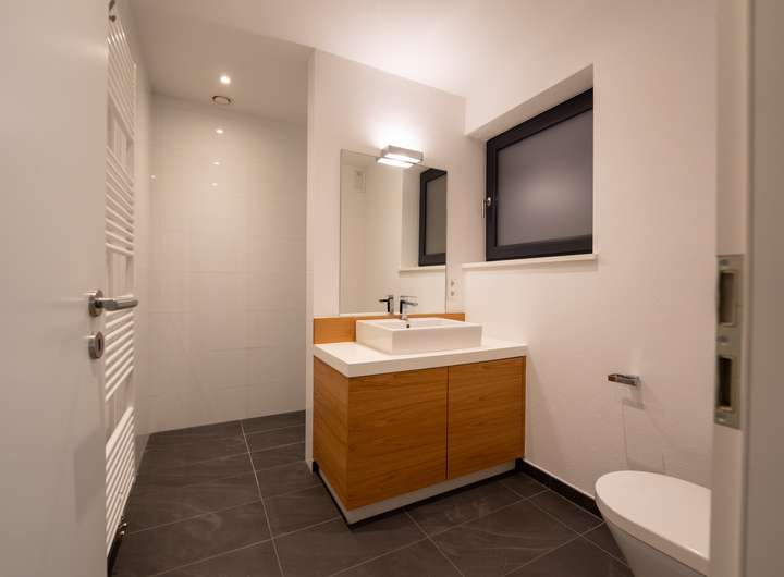 2. Bad im OG, Walk-in-Dusche, Waschbecken auf Eichenplatte mit Einbauschrank, Hansa Armaturen