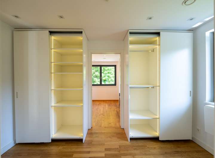 Hochwertige Schreinereinbauten: Garderobe, Foyer und Küche im EG, Ankleide und Bäder
