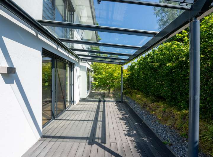 Terrasse überdacht mit Glasdach und elektrischer Sonnenmarkise,