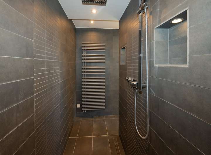 Duschbad im Kellergeschoss, gefliest, ausgestattet mit Walk-in Dusche, Waschbecken (Duravit), Armaturen von Hansa und WC