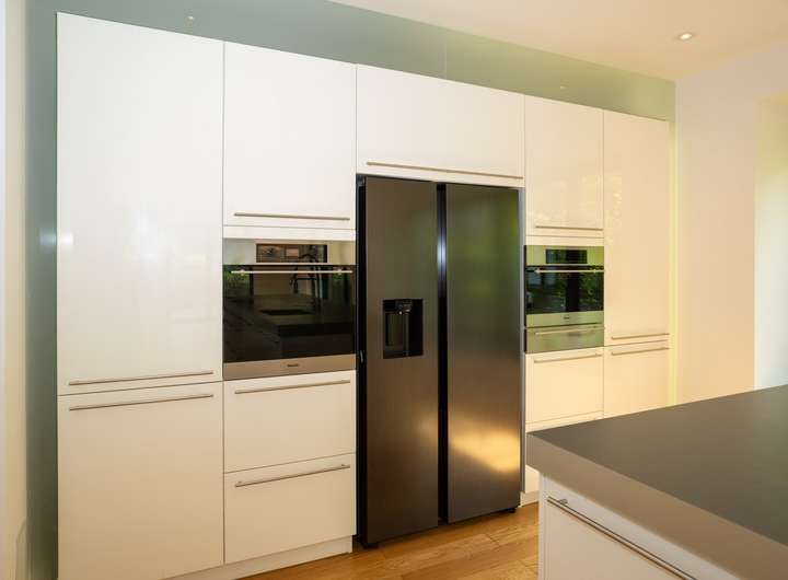 Einbauküche mit weiß glänzenden Fronten, große Arbeitsfläche ausgestattet mit Induktionskochfeld, Insel-Dunstabzugshabe, Dampfgarer mit Warmhalter, Backofen, Geschirrspüler (Miele), Samsung Kühlgefrier-kombination mit Eismacher, bündig eingelassener Spüle mit Schlauchbrausen-Armatur und separatem Wasserhahn mit unaufbereitem Wasser.