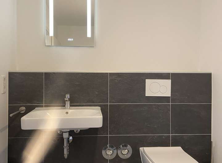 Modernes Designerbad mit LED-Spiegel, spülrandlosem WC, Dusche oder Wanne