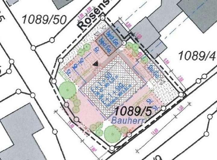 Laut vorliegenden Vorbescheid kann das Grundstück mit einem Mehrfamilienhaus mit Garagen und Stellplätzen bebaut werden.