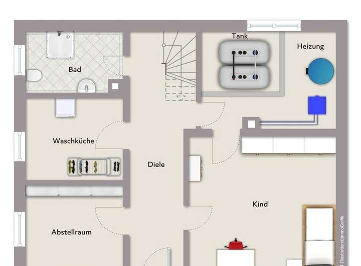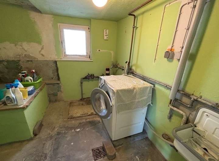 Das Haus verfügt über zwei Eingänge. Einer davon befindet sich im Souterrain des Gebäudes und ermöglicht den Zugang zum geräumigen Kinderzimmer und zum Duschbad mit Tageslicht. Außerdem befinden sich im UG Funktionsräume wie Heiz- und Tankraum, Waschküche und ein Hauswirtschaftsraum. In der Ecke zum Treppenaufgang zum EG weist die Wand Feuchtigkeit auf.