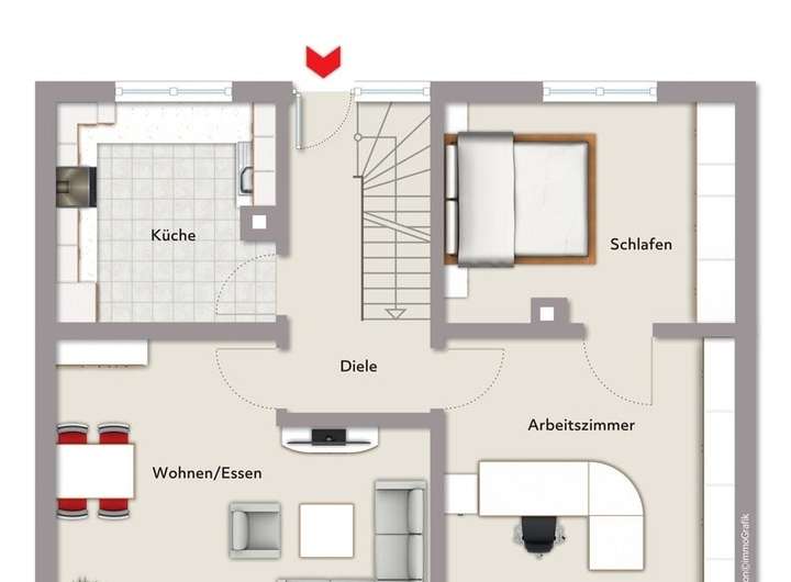 Vom Haupteingang des Hauses gelangt man ebenerdig zu den Räumen des Erdgeschosses. Hier befinden sich ein heller Wohn-/Essbereich, ein ebenfalls helles Arbeitszimmer, ein gut einzurichtendes Schlafzimmer und die praktische Küche. Über eine Holztreppe gelangt man zum DG des Einfamilienhauses, hier wurde ein Zimmer bereits als Hobbyraum ausgebaut und ist an den Heizkreislauf angeschlossen. Der Rest des Dachgeschosses kann als Abstellbereich genutzt werden.