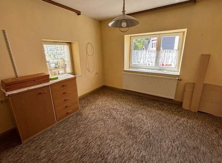 Das in seiner Grundform ca. 1875 erbaute Wohnhaus wurde durch einen Umbau in seine aktuelle Form gebracht. Es bietet auf zwei Ebenen im Souterrain und EG ca. 90 m² Wohnfläche, im DG ist außerdem ein Zimmer als Hobbyraum ausgebaut, welches aber aufgrund der fehlenden Dachdämmung nicht als Wohnraum einbezogen wird.