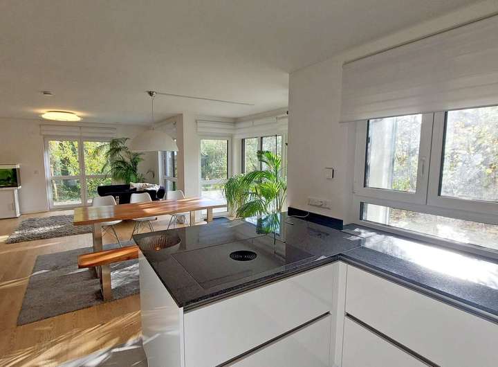 Herzstück des Erdgeschosses ist der offen gestaltete Wohn-Essbereich mit integrierter Küche – ein luftiger Raum mit rund 47 m², großen Fensterfronten und Zugang zur Südwest-Terrasse. Die hochwertige Einbauküche von Küchentreff Dilling, in Kristallweiß Hochglanz und mit Naturstein-Arbeitsplatte in „Blue Night“ ist mit modernster Technik ausgestattet. Eine angrenzende Speisekammer rundet das stimmige Wohnkonzept ab.