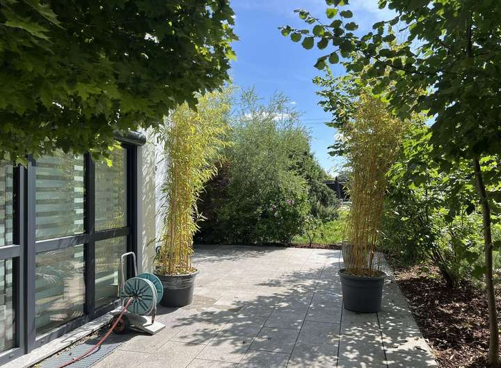Die großzügige Terrasse (über 50 m²) wurde von einem Gartenbaufachbetrieb gestaltet. Der eingewachsene, pflegeleichte Garten bietet Privatsphäre und Platz für Familien, Gartenliebhaber oder alle, die einfach gerne im Freien sind. Ergänzt wird das Angebot durch eine Einzelgarage mit elektrischem Tor sowie einen zusätzlichen Stellplatz – ein stimmiges Gesamtpaket mit hohem Wohlfühlfaktor.