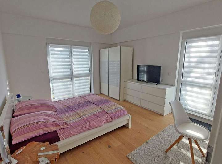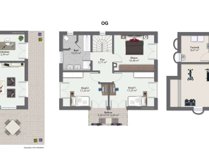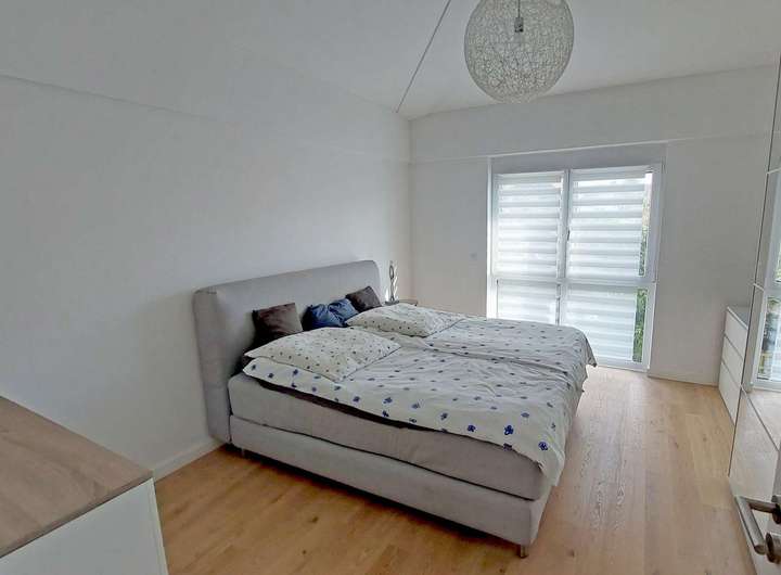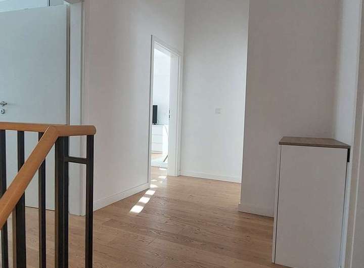Im Obergeschoss befinden sich drei nahezu gleich große, helle Schlafzimmer mit einheitlichem Parkettboden (je ca. 16–17 m²). Zwei der Zimmer verfügen über direkten Zugang zum Balkon mit Blick ins Grüne. Ergänzt wird die Etage durch das hochwertig ausgestattete Hauptbad, das Komfort auf gehobenem Niveau bietet.