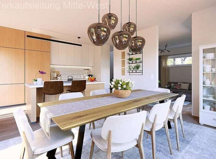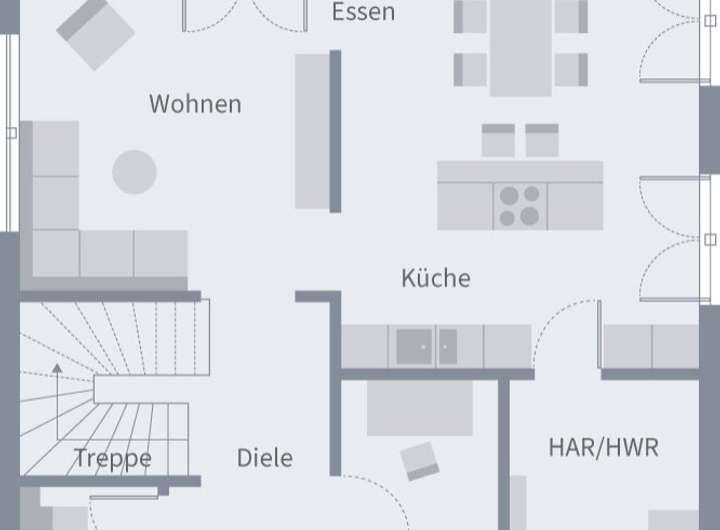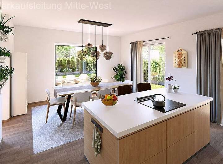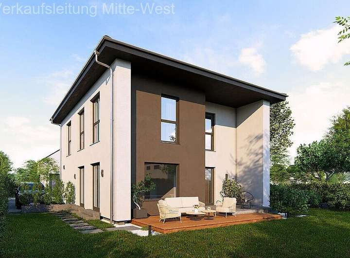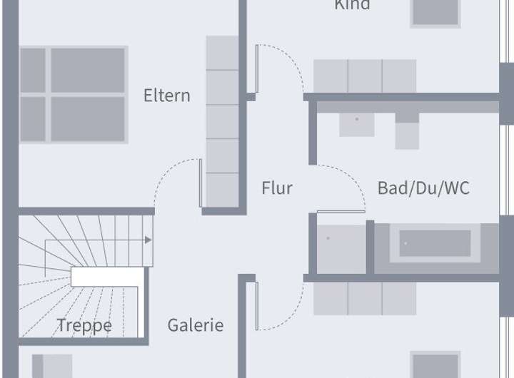 Das Herz dieses Hauses schlägt im offenen Küchen-, Wohn- und Essbereich, in dem Kochen, Genießen und Wohnen fließend ineinander übergehen und dennoch harmonisch gegliedert bleiben. Die Küche schließt praktisch an den Hauswirtschaftsraum an, kurze Wege erleichtern den Alltag. Ein separates Büro im Erdgeschoss bietet Raum für konzentriertes Arbeiten, Gäste-WC und Diele fügen sich unaufdringlich in die Grundrissstruktur ein. Im Dachgeschoss verbinden sich Funktion und Großzügigkeit: Zwei lichtdurchflutete Kinderzimmer, ein Elternschlafzimmer und ein komfortables Bad gruppieren sich um eine ästhetische Galerie, die dem Geschoss Leichtigkeit verleiht und den Blick ins Haus öffnet. Von außen setzt das Haus ein klares architektonisches Statement. Der moderne Silhouettenüberstand sorgt für Tiefe, während Symmetrien und feine Fassadenabsetzungen für visuelle Spannung sorgen. Der überdachte Hauseingang empfängt Bewohner und Gäste gleichermaßen einladend - ein Haus, das innen wie außen mit Anspruch geplant ist.