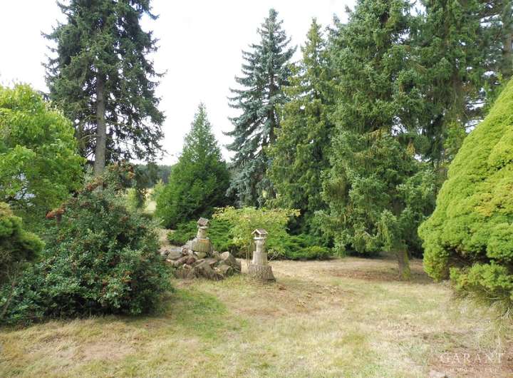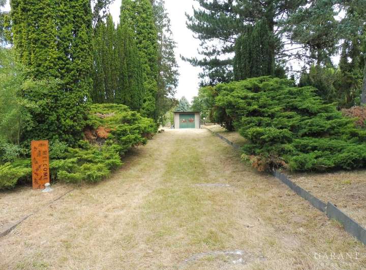 Im Südteil des liebevoll gepflegten Anwesens sind zahlreiche Anpflanzungen aus aller Welt anzutreffen. So sind Serbische Fichte, Latschenkiefer, Abendländischer Lebensbaum, Schwarzkiefer und Kaukasus-Fichte ebenso vorzufinden wie mehrere unterschiedliche Taxus-Arten, Lawsons Scheinzypresse, Blautanne und Chinesischer Lebensbaum. Im nördlichen Teil sind Rasenflächen und Obstbäume charakteristisch. Trinkwasser und Strom liegen an. Die Brauchwasserentsorgung erfolgt über eine abflusslose Schmutzwassersammelanlage aus Polyäthylen mit einem Nutzinhalt von 3 m³, welche 2020 errichtet wurde. Unter der Küche befindet sich ein kleiner Keller, welcher zur Vorratslagerung genutzt wird.