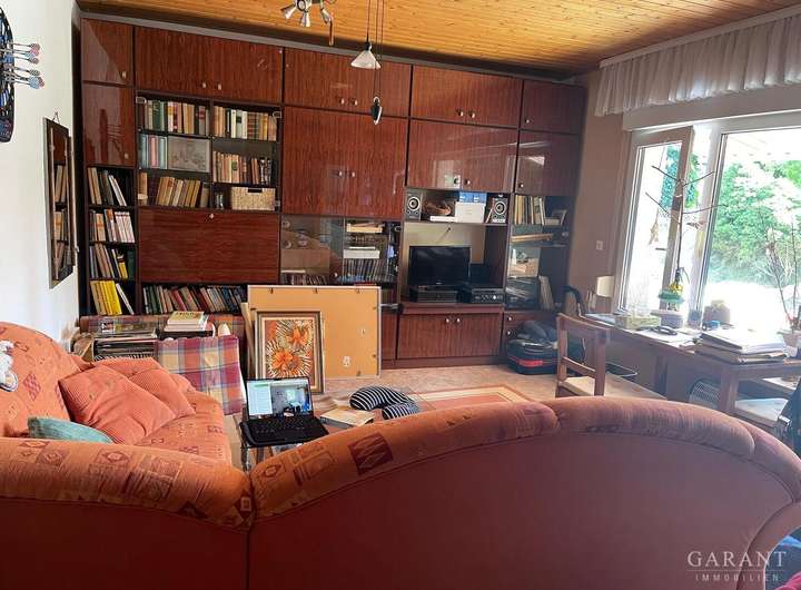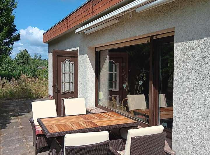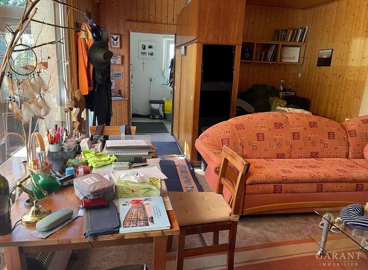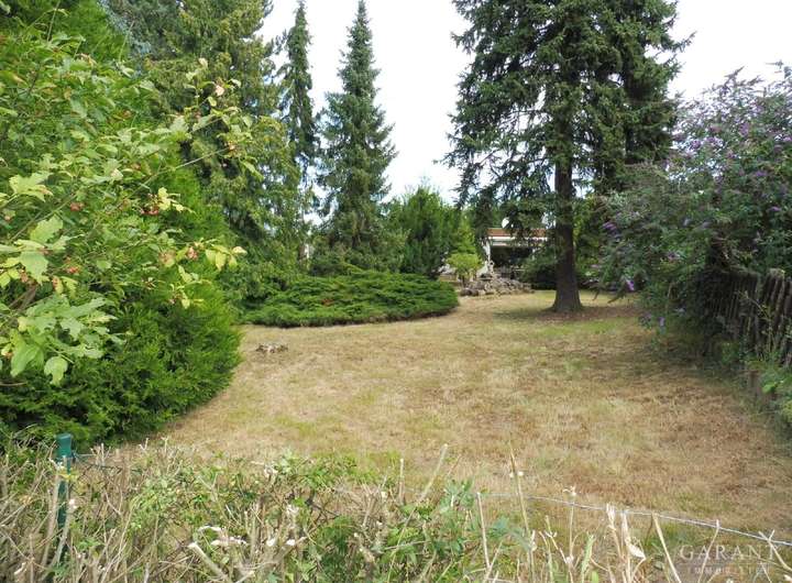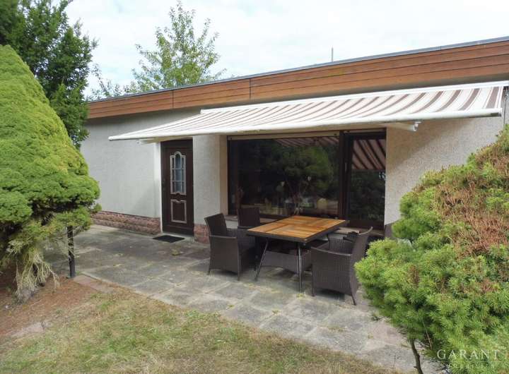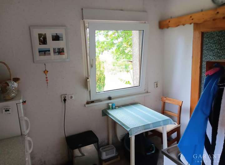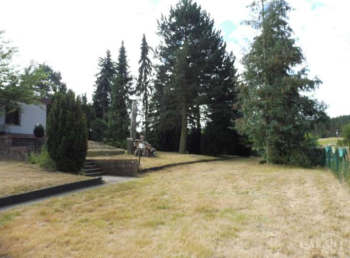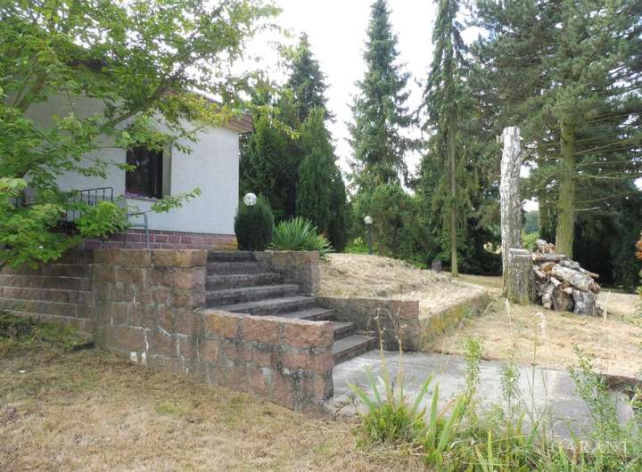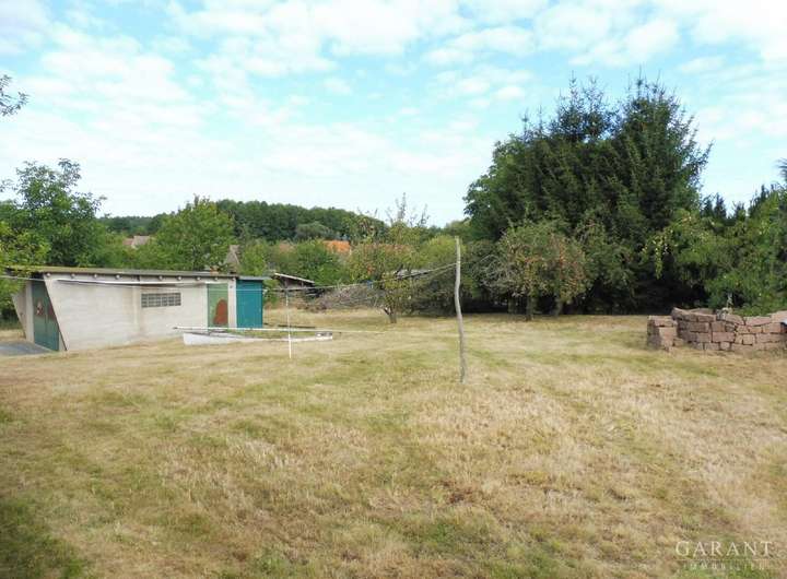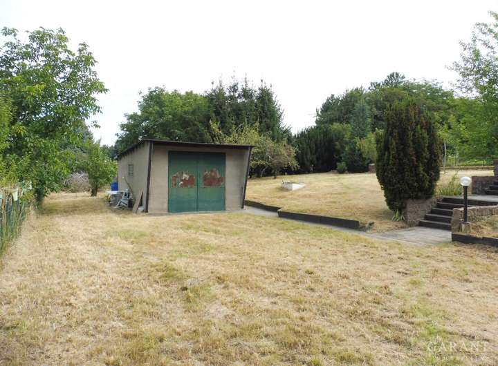 Das knapp 2.000 qm große Grundstück ist mit einem massiven Bungalow mit ca. 34 qm Wohn- und Nutzfläche bebaut, welcher Wohn- und Schlafzimmer, eine kleine Küche, das WC mit Dusche und Waschbecken und den Keller beherbergt. Eine Garage steht im nordwestlichen Teil des Anwesens.