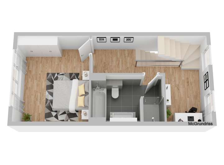 Noch im Eingangsbereich führt rechts eine Treppe in das Obergeschoss. Hier befinden sich die privaten Rückzugsräume. Geradeaus liegt ein großzügiges Schlafzimmer, das sich ideal als Elternschlafzimmer eignet. Die ruhige Lage zur Gartenseite und die angenehme Raumgröße sorgen für erholsame Nächte. Einige Schritte weiter erreichen Sie das Badezimmer, das durch seine klare Struktur besticht. Beim Eintreten erwartet Sie zunächst eine moderne Walk-in-Dusche. Dahinter folgen eine Badewanne, ein stilvoller Waschtisch und das WC – alles in einem stimmigen, zeitlosen Design. Am Ende der Diele befindet sich ein offener Bereich, der sich wunderbar als Homeoffice nutzen lässt. Hier lässt sich konzentriert arbeiten, ohne sich vom restlichen Wohnbereich zurückziehen zu müssen.