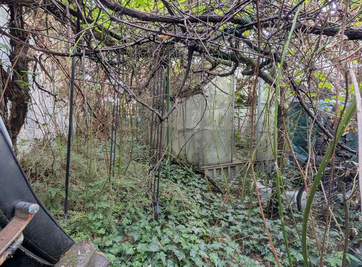Der Garten ist aktuell verwildert mit Bäumchen und Gestrüpp. Über den Garten hinter dem Haus haben Sie Zugang zur Werkstatt und einem weiteren Raum unter der Garage. Der Garten lädt nach Freilegen zum Entspannen ein.