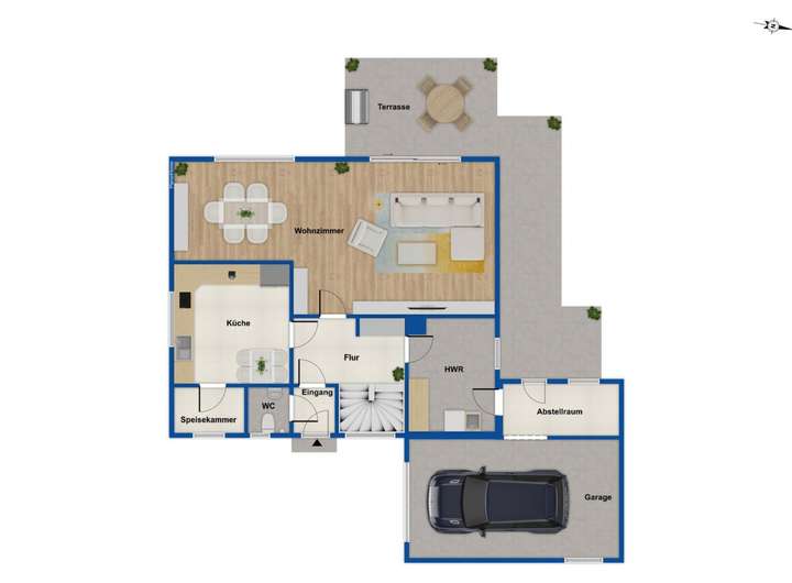 Im Erdgeschoss empfängt Sie ein freundlicher Eingangsbereich mit Gäste-WC. Die Küche bietet ausreichend Platz für eine gemütliche Sitzecke und grenzt an einen praktischen Abstellraum für Vorräte und die nützlichen Dinge des Haushalts. Herzstück des Hauses ist das großzügige, lichtdurchflutete Wohnzimmer mit breiter Fensterfront und wertigem Parkettboden – von hier aus gelangen Sie direkt auf die sonnige, blick geschützte Terrasse in Südwest-Ausrichtung, ausgestattet mit einer Markise für angenehmen Schatten an heißen Tagen. Besonders nützlich ist der große Hauswirtschaftsraum im Erdgeschoss – er ermöglicht einen direkten Zugang über den angrenzenden Geräteraum in die Garage.
