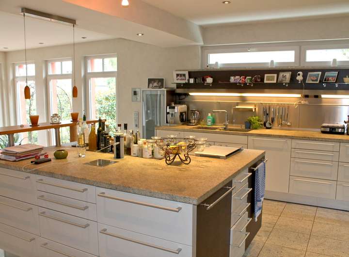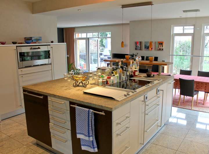 Die angrenzende, hochwertig ausgestattete Küche bietet viel Platz zum Kochen und Genießen. Top-Austattung mit Markengeräten und einer funktionalen Raumaufteilung machen Sie zum Traum jeder Hobbyköchin und jedes Hobbykochs.
