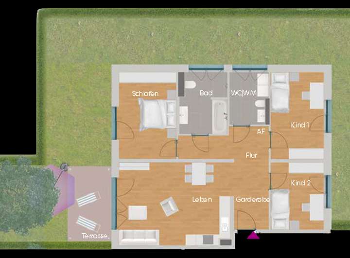 Behaglichkeit: Außenwände aus Holz sorgen für ein angenehmes Raumklima. Die Fußbodenheizung passt sich in allen Wohnräumen Ihren individuellen Bedürfnissen an.