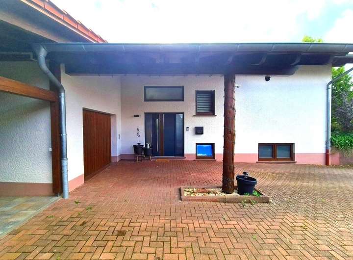 Überdachter Hauseingang, Garage(elektrische Bedienung) mit Platz für 4 Fahrzeuge, 2 Carports, Stellfläche für Wohnmobil und Fuhrpark
